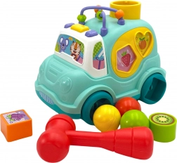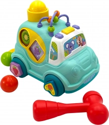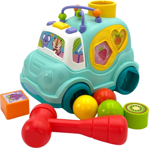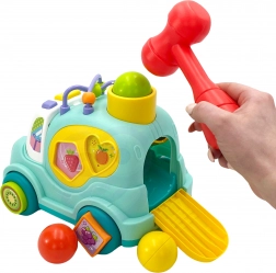 Autíčko nabízí mnoho interaktivních prvků, jako je kladívko a barevné míčky, které zvyšují úroveň zábavy a rozvíjí motorické dovednosti.