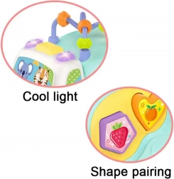 Zahrnuje tvarový sorter s barevnými kostkami, který pomáhá rozvíjet koordinaci oko-ruka a rozpoznávání tvarů.