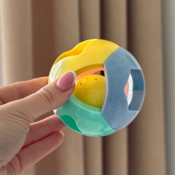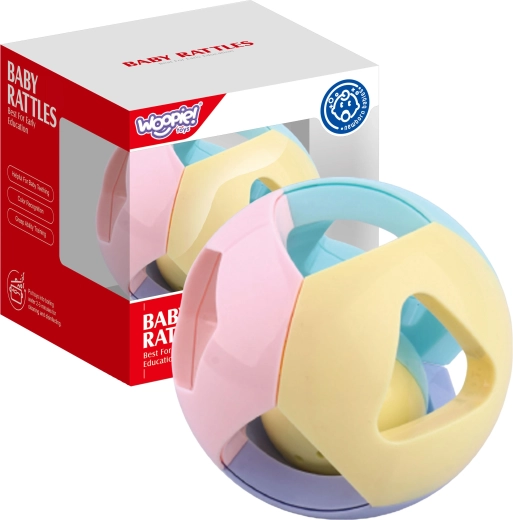 Pastelová koule WOOPIE okouzlí miminka i rodiče. Díky odlehčené konstrukci s otvory ji děťátko snadno uchopí, protřepe a skutálí. Vnitřní prvky se při otáčení pohybují a vytvářejí jemné chrastění, které stimuluje sluch a motivuje k dalšímu zkoumání. Měkké gumové gripy jsou šetrné k dásním a poslouží jako kousátko při prořezávání zoubků.