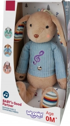 Plyšový pes je vybaven třemi senzorickými zónami - na tlapkách a břiše, které při doteku spouští melodie. Jeho růžové tváře se rozsvítí, což vytváří magickou atmosféru kolem hračky. Mazlíček je oblečený ve svetru, pod kterým je prostor pro 3 baterie. Tento měkký mazlík se stane přítelem pro vaše dítě již od útlého věku.