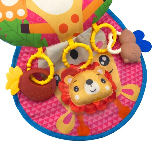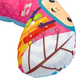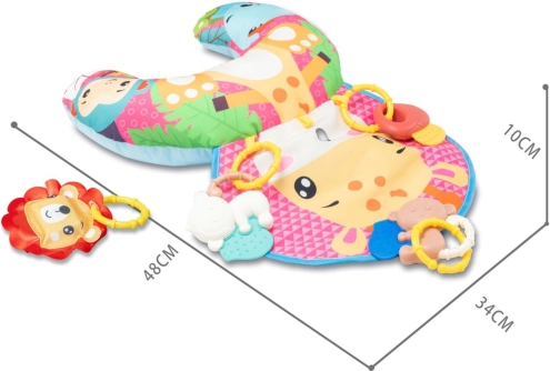 Šusticí plošky, kontrastní barvy a textury povzbuzují pozornost a soustředění. Odnímatelná chrastítka a měkké kousátko ulevují při prořezávání zoubků a zároveň rozvíjejí úchop a jemnou motoriku. Kvalitní zpracování a bezpečné materiály dělají z polštáře skvělý dárek pro novorozence.