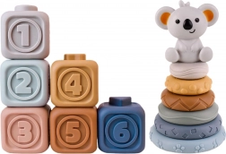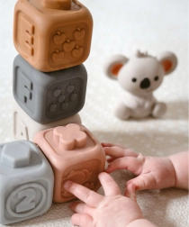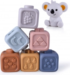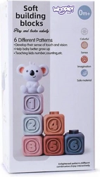 Měkké silikonové senzorické kostky WOOPIE v jemných pastelových barvách podporují raný rozvoj dítěte už od narození. Šest kostek s vystouplými čísly rozvíjí hmat, zrak i logiku, bezpečný materiál slouží i jako kousátko při prořezávání zoubků. Kostky lze stohovat, mačkat (pískají), spojovat díky reliéfům a užít si je také při hráčkách ve vodě. Roztomilá koala dodává sadě hravý šarm.