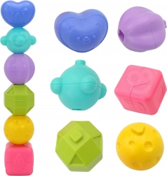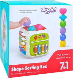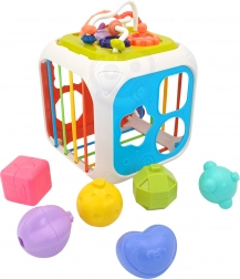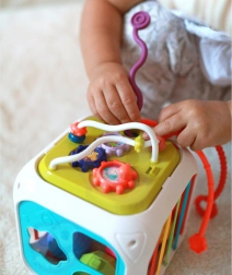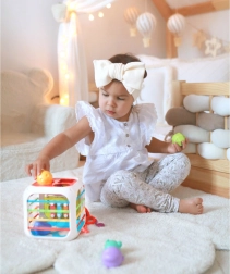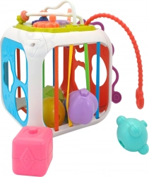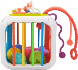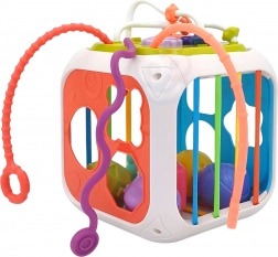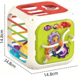Kostka je vyrobena z kvalitního ABS plastu a silikonu, je odolná a bezpečná pro dětské ručky. Součástí jsou i třídicí kostky s ukrytými rolničkami, které motivují k experimentování se zvukem, tvary a barvami. Odnímatelná horní část rozšiřuje možnosti hry – dítě ji může používat samostatně na podložce nebo v kočárku.