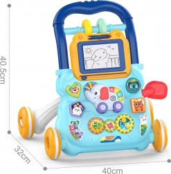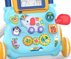 Chodítko obsahuje také sadu bloků různých tvarů s obrázky zvířat, což zavádí do hry učení tvarů, barev a zvířat. Pohyblivé ozubené kolečko se otáčí, když s ním dítě manipuluje, a přináší prvek překvapení.