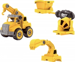 4 auta (jeřáb, domíchávač, sklápěč, bagr), šroubovák se 3 nástavci