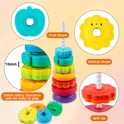 - Sada obsahuje šest kroužků různých tvarů, které lze skládat na sebe a vytvořit barevnou, točící se pyramidu