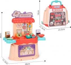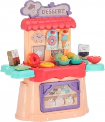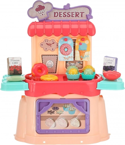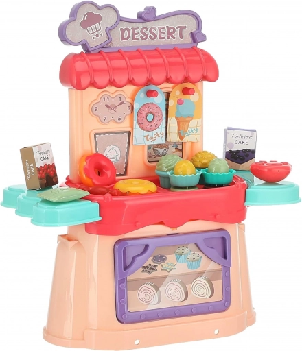 Součástí jsou zmrzliny, donuty, cukrovinky, misky, krabičky a další doplňky pro realistickou hru na obchod a cukrárnu.