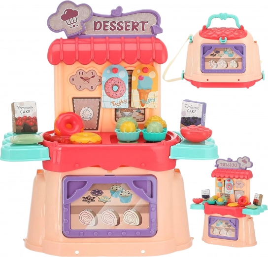 Tato barevná sada přináší dětem svět sladkostí – od donutů a cupcaků po zmrzlinu – a zároveň praktickou konstrukci, která se během chvilky promění z kompaktního kufříku v plnohodnotný pultík. Díky ramennímu popruhu ji děti pohodlně přenesou a mohou si otevřít vlastní mini cukrárnu kdekoliv.