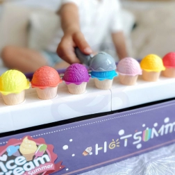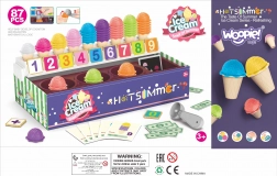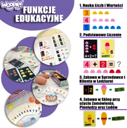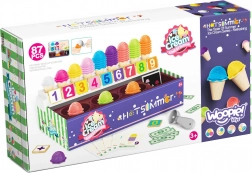 Hrací sada zmrzlinárny od značky Woopie nabízí nejen zábavu při hře na malého prodavače zmrzliny, ale také nabízí učení čísel, barev a základního sčítání. Obsahuje 87 dílů včetně zmrzlinových kuliček, kornoutů, objednávkových karet, peněz, žetonů s čísly a zmrzlinové lžičky.