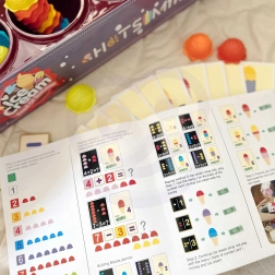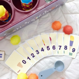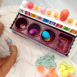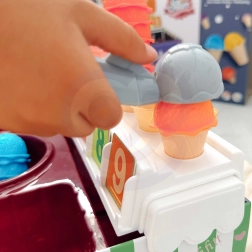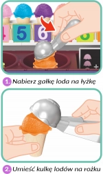 Obsahuje zmrzlinové kuličky, kornouty, objednávkové karty a peníze, podporující počítání a nápaditou hru.