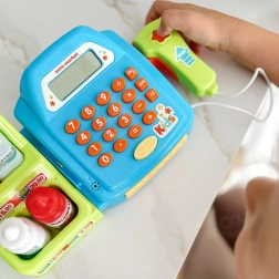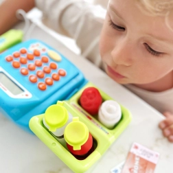 Integrovaná kalkulačka pomáhá sčítat nákupy, zatímco zásuvka bezpečně uloží mince a bankovky – učení počítání peněz hrou.