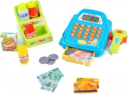 Set obsahuje platební kartu, bankovky, mince, krabičku se sušenkami a polici s artikly pro kompletní hru na obchod.