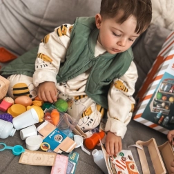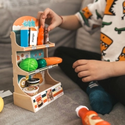 Hra na obchod podporuje samostatné myšlení, komunikaci a tvořivou hru. Díky 42 prvkům – od ovoce a zeleniny po nápoje a konzervy – si děti mohou vytvářet vlastní scénáře a procvičovat každodenní situace.