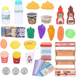 Sada obsahuje ovoce, zeleninu, nápoje, konzervy, bankovky i mince – vše pro dlouhé hodiny kreativní hry v obchodě.