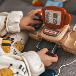 Děti mohou „pípat“ zboží a slyšet autentické zvuky skenování. Zásuvka na peníze a tlačítka podporují realistickou hru a učení o platbě.