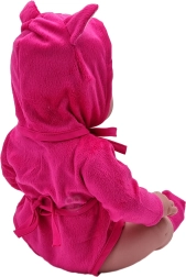 Panenka má na sobě roztomilý růžový obleček s medvědím designem a kapucí, což poskytuje hravý a atraktivní vzhled.