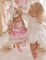Panenka nosí růžové šaty s roztomilými volány a růžové botičky s odpovídající čelenkou, což dodává na její půvabné vizáži. Jejich interaktivní funkce zahrnují různé reakce na podněty, včetně smíchu, pláče a spokojeného bublání při objímání. Panenka je také vybavena zvukovým systémem, který vyžaduje tři baterie typu AA (nejsou součástí balení).