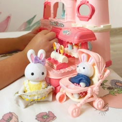 Děti vytvářejí vlastní příběhy s králíčky, pejskem a doplňky jako kočárek či vozík se zmrzlinou – ideální pro kreativní hru.