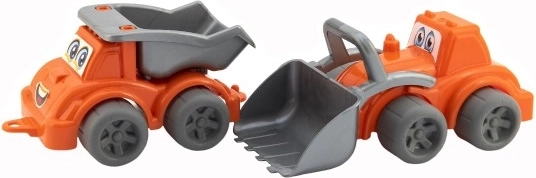 Díky kvalitnímu plastu a pevnému zpracování jsou hračky odolné vůči každodennímu používání. Sada obsahuje nakladač s funkční lžící a sklápěcí auto s korbou, které se skvěle doplňují při hraní na stavbě.