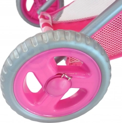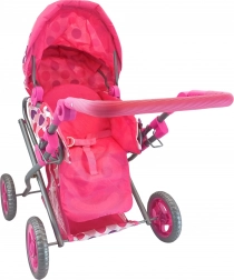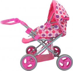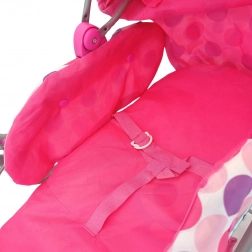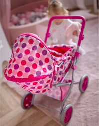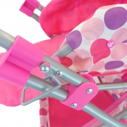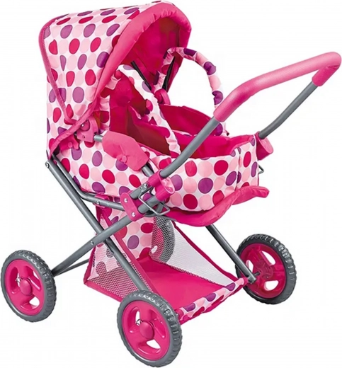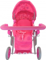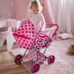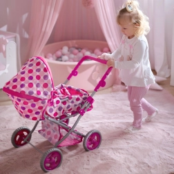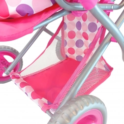 Kočárek má atraktivní růžový design s puntíky, který zaujme každé dítě.