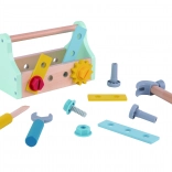 Roztomilá dřevěná bedýnka s nářadím od značky TOOKY TOY je ideální pro malé kutily od 3 let. Sada obsahuje 18 dílů v pastelových barvách – kladívko, šroubovák, klíč, šrouby, matice, ozubená kola a destičky. Díly lze snadno připevnit do otvorů v bedýnce a po hraní je pohodlně uložit dovnitř. Vyrobeno z kvalitního dřeva s netoxickými barvami a navržené pro rozvoj jemné motoriky, kreativity a koordinace ruka–oko.