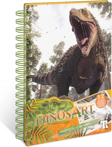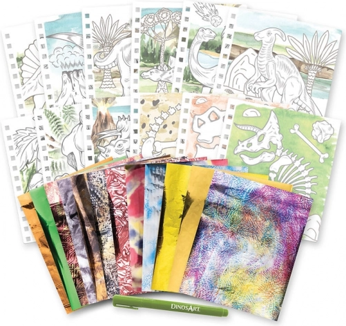 Kreativní fóliové omalovánky DinosArt: 12 předloh, 12 fólií, lepící pero a informace o dinosaurech. Lesklé efekty, snadné tvoření, skvělý dárek pro děti.