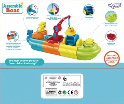 Součástí jsou roztomilí pasažéři – kačenka, která stříká vodu, a želvička na palubě. Nechybí kormidlo, paluba a praktické nádobky na vodu pro nabírání a přelévání.