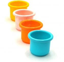 Čtyři barevné kelímky mají na dně různé otvory, takže při přelévání vznikají odlišné vodní efekty. Děti se tak přirozeně učí rozlišovat barvy, trénují koordinaci oko–ruka a posilují kreativitu. Odolné, hladké materiály jsou příjemné na dotek a snadno se čistí.