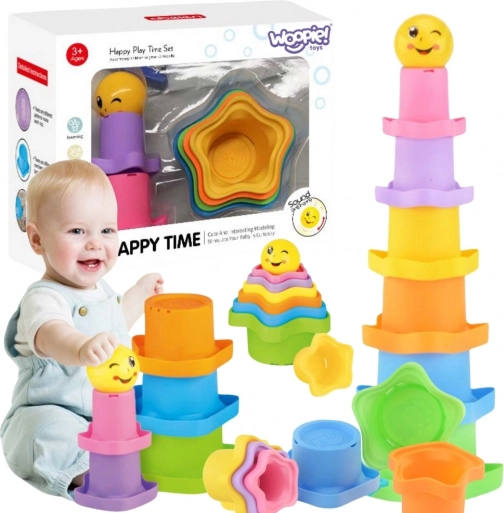 Každý kelímek má jinou barvu a hvězdičkový tvar. Děti se přirozeně učí třídění a porovnávání, rozvíjejí logiku i zrakové vnímání.
