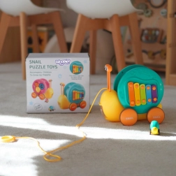 Tento multifunkční šnek od značky WOOPIE zaujme děti od prvního pohledu. Barevná ulita slouží jako xylofon s klávesami, do kterých lze ťukat vyjímatelnými „očičky“ – paličkami. Díky pevnému provázku mohou děti šneka tahat i postrkovat, a rozvíjet tak koordinaci oko–ruka i rovnováhu. Na hřbetě je umístěno tlačítko, které otevře vystřelovací dráhu pro malé autíčko-šneka a postará se o spoustu radostných momentů.