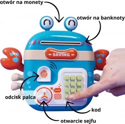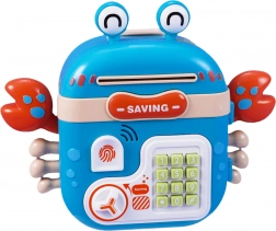 Roztomilá elektronická pokladnička ve tvaru kraba od značky WOOPIE pomáhá dětem od 3 let učit se šetřit. Nabízí bezpečné uložení mincí a bankovek, PIN kód, simulovanou čtečku otisku prstu a interaktivní zvuky. Multifunkční provedení (pokladnička, sejf i batoh) z odolného plastu je bezpečné pro děti a zábavnou formou rozvíjí finanční dovednosti.