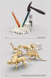 6 sádrových bloků se skeletům dinosauřů, kladívko, dlátko, štěteček, rozprašovač na vodu, ochranné brýle