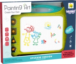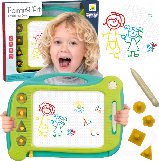 Barevná magnetická kreslicí tabulka WOOPIE je skvělá pomůcka pro děti od 3 let, která podporuje psaní, kreslení a kreativitu. Díky magnetickému povrchu lze tvořit nekonečné množství obrázků a jedním tahem je vymazat pomocí posuvníku. Součástí je magické pero a 4 razítka, praktické ucho pro přenášení a kompaktní provedení na cesty.