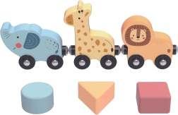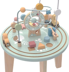 Tento kvalitní dřevěný stolek přináší dětem pestrý svět tvarů a barev. Dvoustopý motorický labyrint trénuje obratnost prstů, třídička tvarů učí poznávat tvary a barvy, ozubená kola rozvíjejí logiku a příčinné souvislosti a vláček s roztomilými zvířátky objíždí trasu kolem stolku.