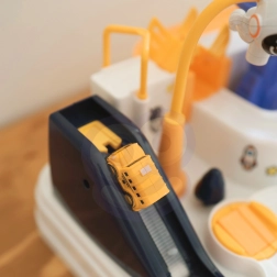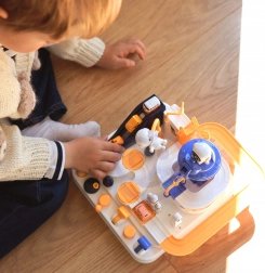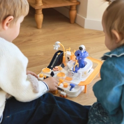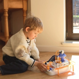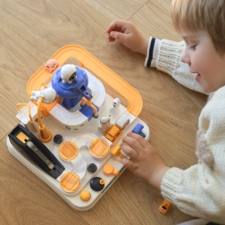 Vesmírná stanice se mění v akční hřiště: děti plánují trasu, zdolávají překážky a pomocí tlačítek a ovladačů směrují autíčka po rampách, výtazích a otočných plošinách. Magnetická raketa přenáší vozidla „vzduchem“ na zvedací most, který lze dle potřeby spouštět a zvedat.