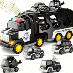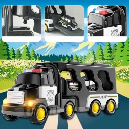 Velký policejní set od značky Woopie přináší 5v1 zábavu: obří transportní tahač a čtyři policejní vozidla (obrněný vůz, cisterna s vodním dělem, helikoptéra, radiovůz). Stačí stisknout tlačítko na kabině a spustí se blikající světla a realistické sirény. Odolná konstrukce, interaktivní efekty a pohyblivé prvky podporují kreativitu a fantazii dětí už od 3 let.