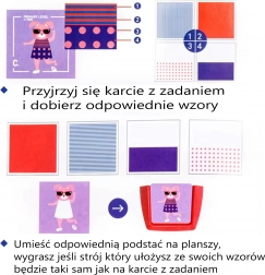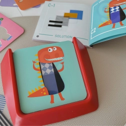 Součástí sady je stabilní stojan, čtyři šablony postaviček a pestrý výběr karet se vzory i knížka s úkoly a řešeními. Hra krásně rozvíjí prostorové vnímání, jemnou motoriku i vizuální percepci tvarů, barev a vzorů. Skvělé jako edukativní dárek pro předškoláky.