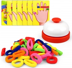 Barevné gumičky se navlékají na prsty podle vzorů na kartách – děti si zábavnou formou procvičí přesnost, obratnost a koordinaci oko–ruka.