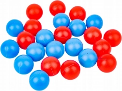Sada 24 plastových míčků (12 červených a 12 modrých) je lehká, odolná a ideální pro opakované hraní doma i na oslavách.