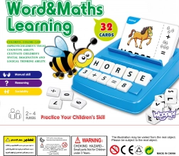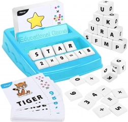 Hra obsahuje modrý plastový tácek a bílé bloky pro učení formou tvoření slov a matematických rovnic.