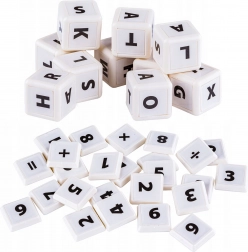 - 32 karet, 1 tác, 10 kostek s písmeny, 20 číselných kostek, 5 kostek symbolů