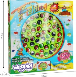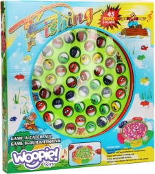 WOOPIE chytání rybiček je interaktivní hra pro celou rodinu. Rotující jezírko a rybičky, které otevírají pusy, prověří postřeh i trpělivost. V balení najdete 5 prutů, 45 rybek a košíčky na úlovky. Hra rozvíjí jemnou motoriku a koordinaci oko–ruka. Napájení: 3× AA (nejsou součástí).