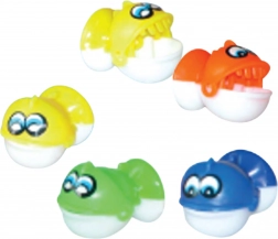Hrací plocha se otáčí a rybičky se pravidelně vynořují s otevřenou pusou – přesné načasování trénuje postřeh i koordinaci.