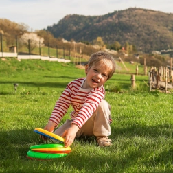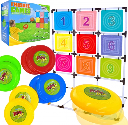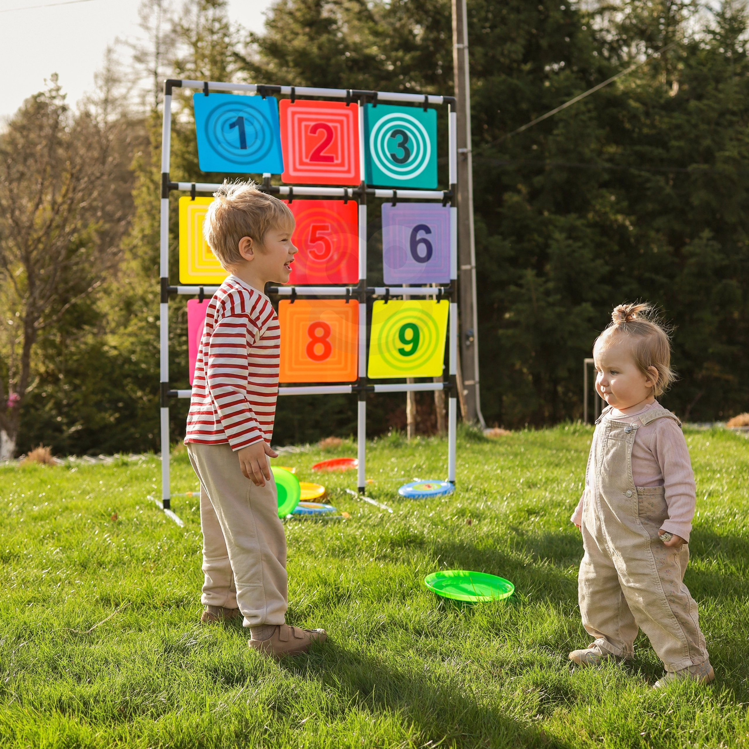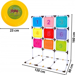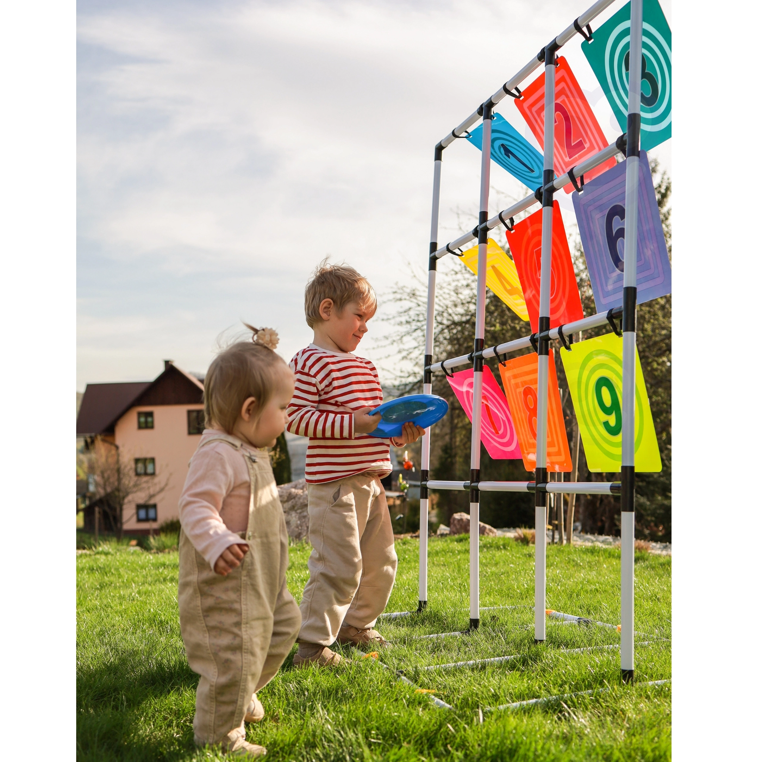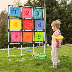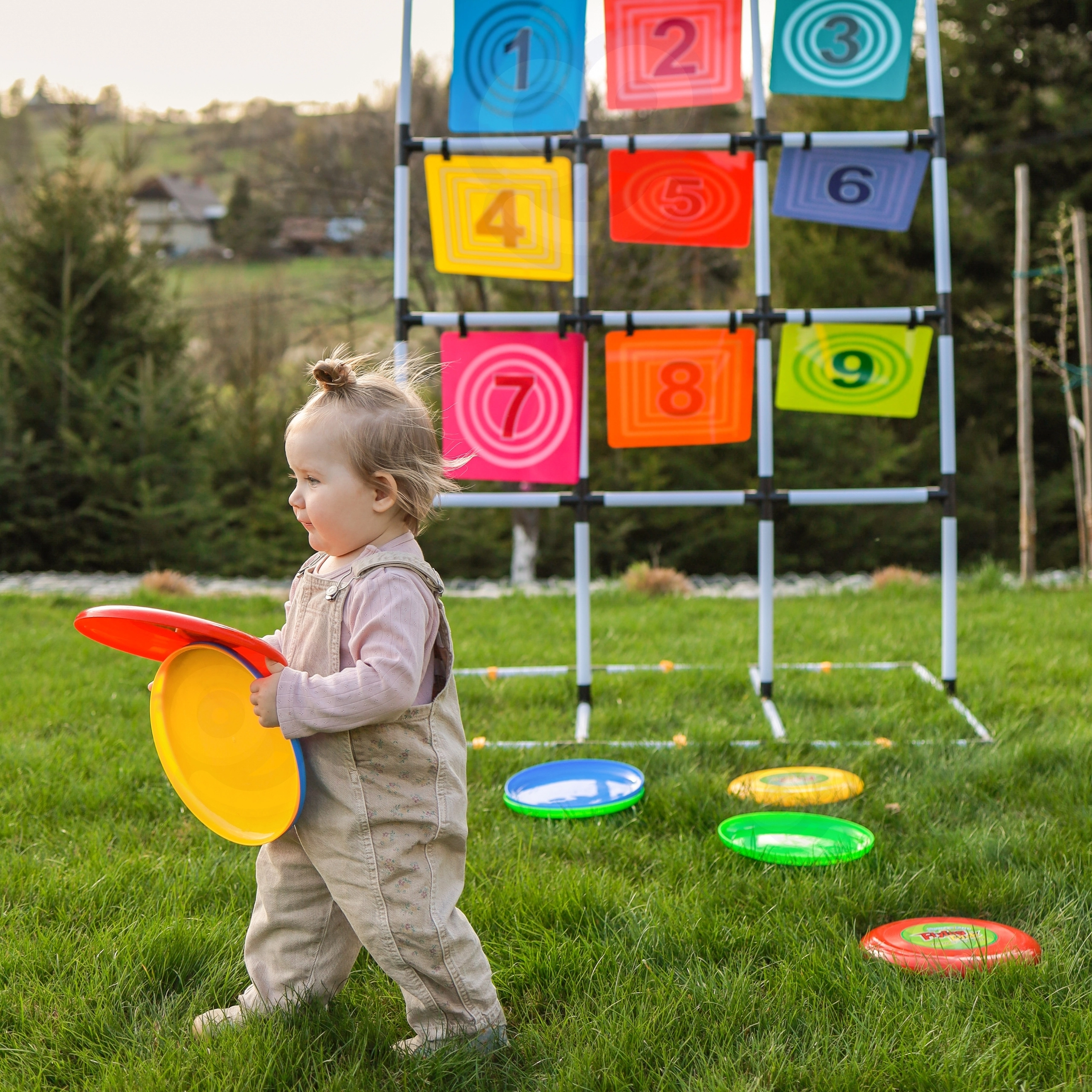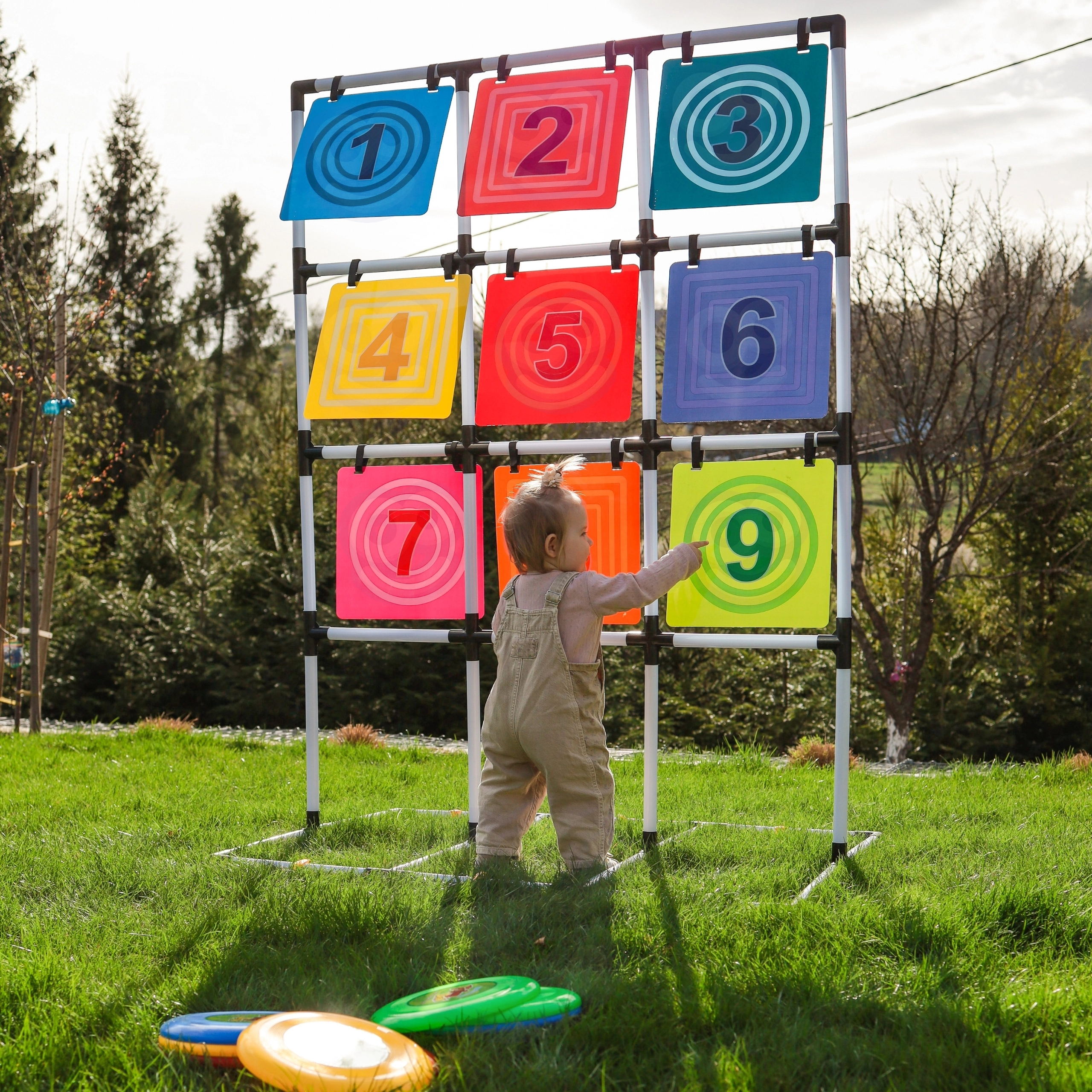 Roztočte zábavu na zahradě, na hřišti nebo v obýváku. Stojan s 3×3 očíslovanými cíli (1–9) a sada osmi létajících disků motivují děti k pohybu, soutěžení a učení se číslům. Hra je díky lehké konstrukci rychle složená i rozložená a snadno přenositelná v prostorné tašce.