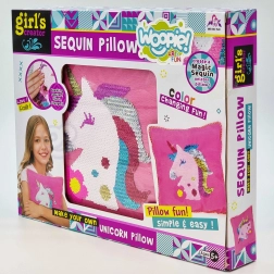 Kreativní sada Woopie ART&FUN přináší dětem zábavné šití a zdobení polštáře s motivem jednorožce. V balení najdete vše potřebné – povlak, polštář, flitry, jehlu a nit. Hotový polštář má kouzelný efekt: při pohlazení mění barvu. Skvělá volba pro rozvoj kreativity, fantazie a jemné motoriky již od 5 let.