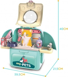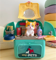 Objevte kompaktní 2v1 set – roztomilý batoh/transportér s průhledem a kompletní mini salon péče o mazlíčka uvnitř. Děti mohou kočičku vykoupat v dřezu s kohoutkem, učesat, ostříhat a poté ji nakrmit z misek. Uzamykatelné dveře a odnímatelný popruh zajišťují pohodlné a bezpečné nošení.