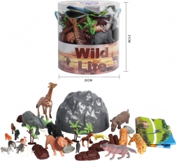 - Figurky zvířat, doplňky (stromky, kameny), tematická mapa safari, úložné vědro