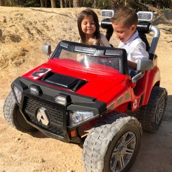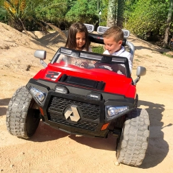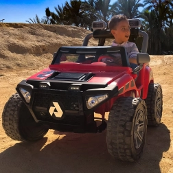 Červené dětské elektrické autíčko INJUSA Monster 24V nadchne malé řidiče od 3 let. Silná baterie 24 V (2× 12 V 7,2 Ah) zajistí rychlost až 7 km/h, dvě sedadla s bezpečnostními pásy a LED světla vpředu i vzadu dodají jízdě styl i bezpečí. Odolná gumová kola, 2 rychlosti vpřed + zpátečka a nosnost do 50 kg z něj dělají ideální volbu pro dobrodružství v terénu.