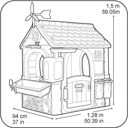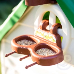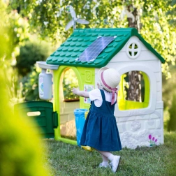 Domeček je dále doplněn karmníkem a budkou pro ptáky, což přináší přirozený dotyk do každé hry. Imaginativní design zahrnuje větrnou turbínu a imitaci solárního panelu, které poskytují skvělou příležitost pro učení o obnovitelné energii. Konstrukce je snadno sestavitelná a odolná vůči UV záření.