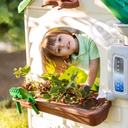 Součástí domečku je i zahradní nářadí, které umožňuje malým zahradníkům sázet semínka a sledovat, jak se jejich rostliny rozvíjejí.